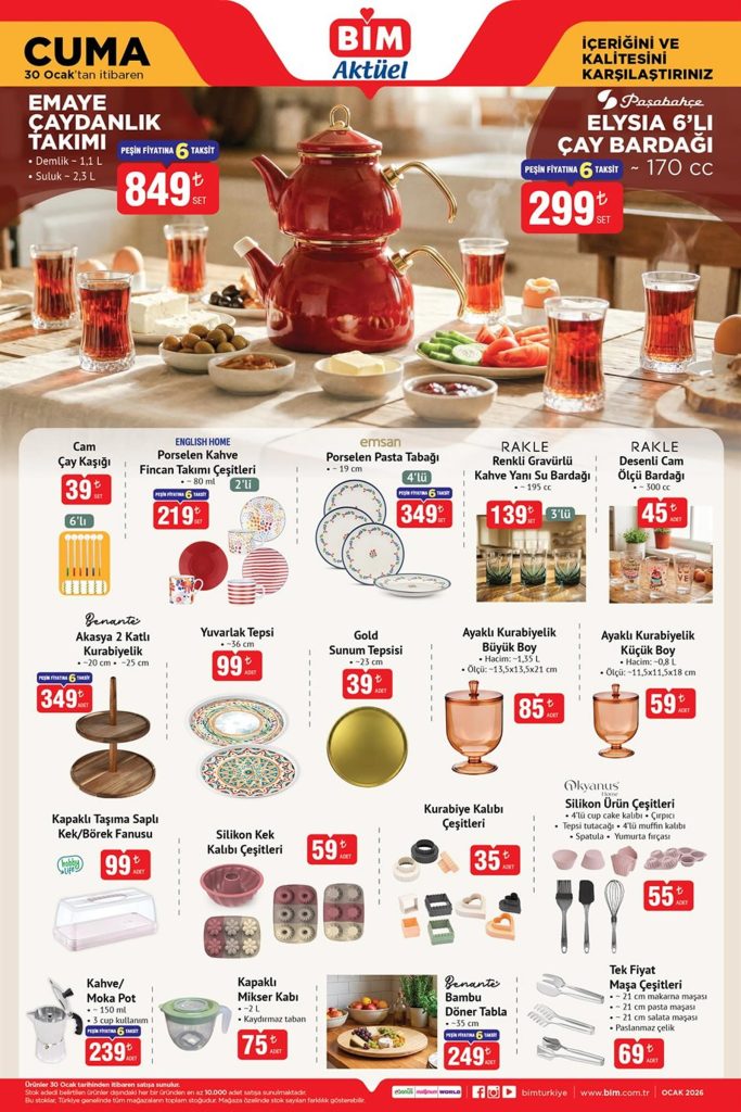 30 Ocak ile 6 Şubat 2026 tarihleri arasında geçerli olacak BİM Cuma Aktüel Ürünler Kataloğu ile gelecek ürünleri ve bu ürünlerin cazip fiyatlarını listeleyelim;